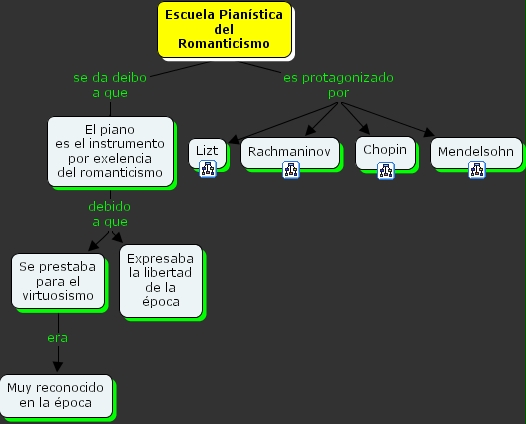 Escuela Pian�stica del Romanticismo es protagonizado por Lizt, Escuela Pian�stica del Romanticismo es protagonizado por Chopin, Escuela Pian�stica del Romanticismo es protagonizado por Mendelsohn, Escuela Pian�stica del Romanticismo es protagonizado por Rachmaninov, El piano es el instrumento por exelencia del romanticismo debido a que Expresaba la libertad de la �poca, El piano es el instrumento por exelencia del romanticismo debido a que Se prestaba para el virtuosismo, Escuela Pian�stica del Romanticismo se da deibo a que El piano es el instrumento por exelencia del romanticismo, Se prestaba para el virtuosismo era Muy reconocido en la �poca