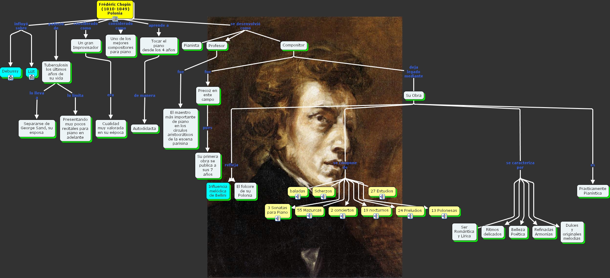 Fr�d�ric Chopin (1810-1849) Polonia aprende a Tocar el piano desde los 4 a�os, Su Obra se caracteriza por Ritmos delicados, Su Obra se caracteriza por Dulces y originales melodias, Su Obra se caracteriza por Belleza Po�tica, Su Obra se caracteriza por Ser Rom�ntica y L�rica, Su Obra se caracteriza por Refinadas Armon�as, Profesor fue El maestro m�s importante de piano en los c�rculos aristocr�ticos de la escena parisina, Fr�d�ric Chopin (1810-1849) Polonia considerado como Uno de los mejores compositores para piano, Precoz en este campo pues Su primera obra se publica a sus 7 a�os, Su Obra es Practicamente Pian�stica, Compositor fue Precoz en este campo, Tuberculosis los �ltimos a�os de su vida lo limita Presentando muy pocos recitales para piano en adelante, Un gran Improvisador era Cualidad muy valorada en su e�poca, Tuberculosis los �ltimos a�os de su vida lo lleva a Separarse de George Sand, su esposa, Fr�d�ric Chopin (1810-1849) Polonia padeci� de Tuberculosis los �ltimos a�os de su vida, Tocar el piano desde los 4 a�os de manera Autodidacta, Compositor deja legado mediante Su Obra, Su Obra refleja Influencia mel�dica de Bellini, Su Obra refleja El folcore de su Polonia, Fr�d�ric Chopin (1810-1849) Polonia se desenvolvi� como Pianista, Fr�d�ric Chopin (1810-1849) Polonia se desenvolvi� como Compositor, Fr�d�ric Chopin (1810-1849) Polonia se desenvolvi� como Profesor, Su Obra se compone de 24 Preludios, Su Obra se compone de 27 Estudios, Su Obra se compone de Scherzos, Su Obra se compone de baladas, Su Obra se compone de 2 conciertos, Su Obra se compone de 19 nocturnos, Su Obra se compone de 55 Mazurcas, Su Obra se compone de 13 Polonesas, Su Obra se compone de 3 Sonatas para Piano, Fr�d�ric Chopin (1810-1849) Polonia influy� sobre Lizt, Fr�d�ric Chopin (1810-1849) Polonia influy� sobre Debussy, Fr�d�ric Chopin (1810-1849) Polonia considerado como Un gran Improvisador