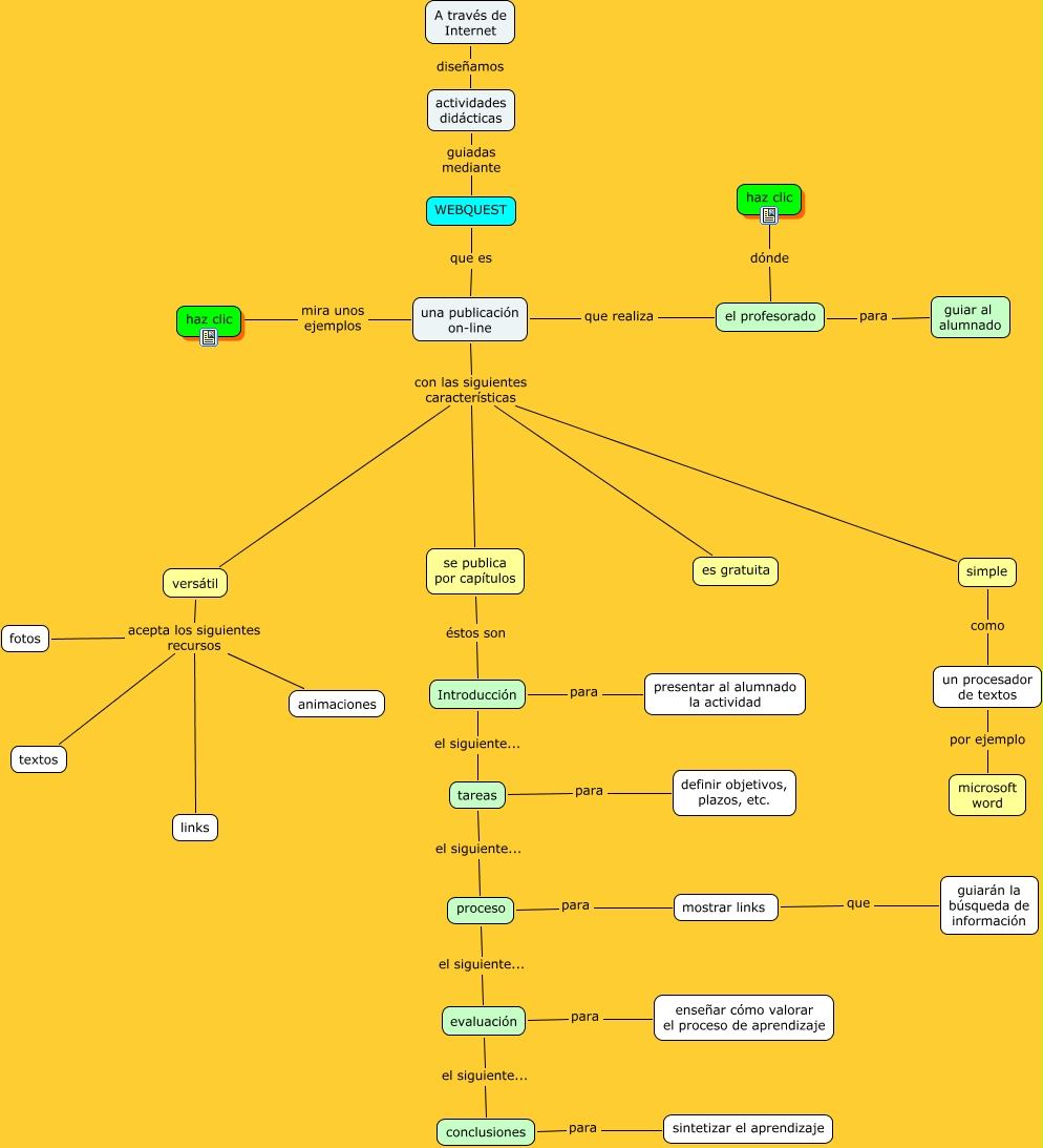 Webquest_castellano, proceso el siguiente... evaluación, conclusiones para sintetizar el aprendizaje, WEBQUEST que es una publicación on-line, evaluación para enseñar cómo valorar el proceso de aprendizaje, mostrar links que guiarán la búsqueda de información, un procesador de textos por ejemplo microsoft word, simple con las siguientes características se publica por capítulos, el profesorado para guiar al alumnado, una publicación on-line con las siguientes características se publica por capítulos, el profesorado dónde haz clic
