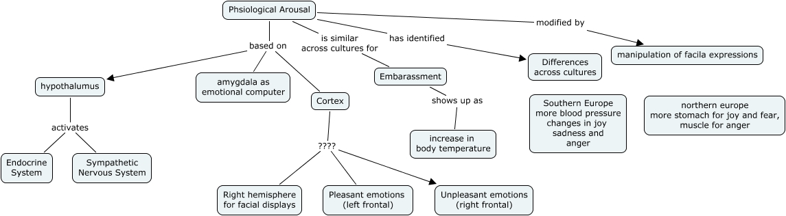 physiological arousal, Phsiological Arousal based on hypothalumus, hypothalumus activates Endocrine System, Phsiological Arousal is similar across cultures for Embarassment, hypothalumus activates Endocrine System, Embarassment shows up as increase in body temperature, Phsiological Arousal has identified Differences across cultures, Phsiological Arousal based on amygdala as emotional computer, Phsiological Arousal based on Cortex, Phsiological Arousal based on hypothalumus, Cortex ???? Right hemisphere for facial displays