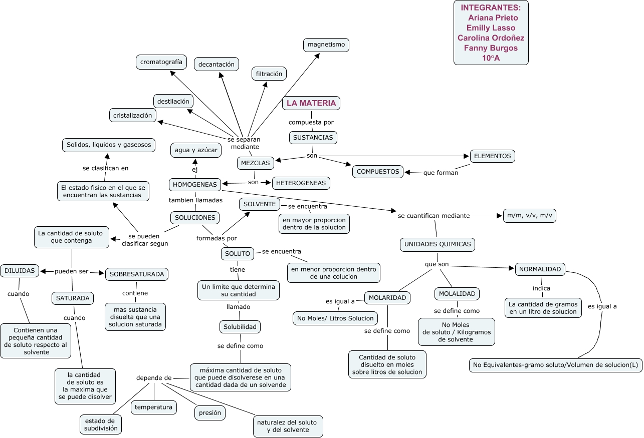 Este Cmap, tiene información relacionada con: SOLUCIONES, MOLARIDAD es igual a No Moles/ Litros Solucion, máxima cantidad de soluto que puede disolverese en una cantidad dada de un solvende depende de estado de subdivisión, MEZCLAS se separan mediante magnetismo, HOMOGENEAS se cuantifican mediante UNIDADES QUIMICAS, MOLARIDAD se define como Cantidad de soluto disuelto en moles sobre litros de solucion, máxima cantidad de soluto que puede disolverese en una cantidad dada de un solvende depende de presión, MEZCLAS se separan mediante decantación, SOLUCIONES formadas por SOLUTO, SUSTANCIAS son MEZCLAS, UNIDADES QUIMICAS que son NORMALIDAD, Solubilidad se define como máxima cantidad de soluto que puede disolverese en una cantidad dada de un solvende, MEZCLAS se separan mediante cromatografía, MEZCLAS son HOMOGENEAS, ELEMENTOS que forman COMPUESTOS, SOLUCIONES se pueden clasificar segun La cantidad de soluto que contenga, SUSTANCIAS son COMPUESTOS, UNIDADES QUIMICAS que son MOLARIDAD, SOLUCIONES formadas por SOLVENTE, NORMALIDAD indica La cantidad de gramos en un litro de solucion, La cantidad de soluto que contenga pueden ser SOBRESATURADA