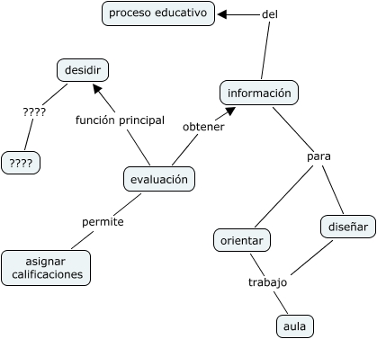 Este Cmap, tiene información relacionada con: evaluación binas, evaluación permite asignar calificaciones, diseñar trabajo aula, información para diseñar, orientar trabajo aula, información para orientar, evaluación obtener información, información del proceso educativo, desidir ???? ????, evaluación función principal desidir