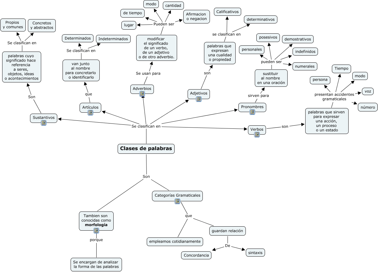 Este Cmap, tiene información relacionada con: Arbol del lenguaje, Clases de palabras Se clasifican en Adjetivos, sustituir al nombre en una oración pueden ser personales, Clases de palabras Son Categorías Gramaticales, Sustantivos Son palabras cuyo significado hace referencia a seres, objetos, ideas o acontecimientos, modificar el significado de un verbo, de un adjetivo o de otro adverbio. Pueden ser de tiempo, palabras que sirven para expresar una acción, un proceso o un estado presentan accidentes gramaticales voz, Adverbios Se usan para modificar el significado de un verbo, de un adjetivo o de otro adverbio., guardan relación De sintaxis, Clases de palabras Se clasifican en Artículos, Adjetivos son palabras que expresan una cualidad o propiedad, Clases de palabras Se clasifican en Adverbios, palabras que expresan una cualidad o propiedad se clasifican en determinativos, palabras que expresan una cualidad o propiedad se clasifican en Calificativos, palabras cuyo significado hace referencia a seres, objetos, ideas o acontecimientos Se clasifican en Propios y comunes, Pronombres sirven para sustituir al nombre en una oración, Categorías Gramaticales que guardan relación, Clases de palabras Se clasifican en Verbos, modificar el significado de un verbo, de un adjetivo o de otro adverbio. Pueden ser lugar, Verbos son palabras que sirven para expresar una acción, un proceso o un estado, Clases de palabras Se clasifican en Pronombres