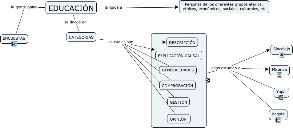 Este Cmap, tiene información relacionada con: MAPA EDUCACIÓN, EDUCACIÓN dirigida a Personas de los diferentes grupos etarios, étnicos, económicos, sociales, culturales, etc, CATEGORÍAS las cuales son OPINIÓN, CATEGORÍAS las cuales son GENERALIDADES, ???? ellas estudian a Yopal, EDUCACIÓN se divide en CATEGORÍAS, CATEGORÍAS las cuales son EXPLICACIÓN CAUSAL, ???? ellas estudian a Miranda, ???? ellas estudian a Bogotá, CATEGORÍAS las cuales son GESTIÓN, EDUCACIÓN dirigida a Personas de los diferentes grupos etarios, étnicos, económicos, sociales, culturales, etc, ???? ellas estudian a Sincelejo, CATEGORÍAS las cuales son DESCRIPCIÓN, EDUCACIÓN la gente opina ENCUESTAS, CATEGORÍAS las cuales son COMPROBACIÓN