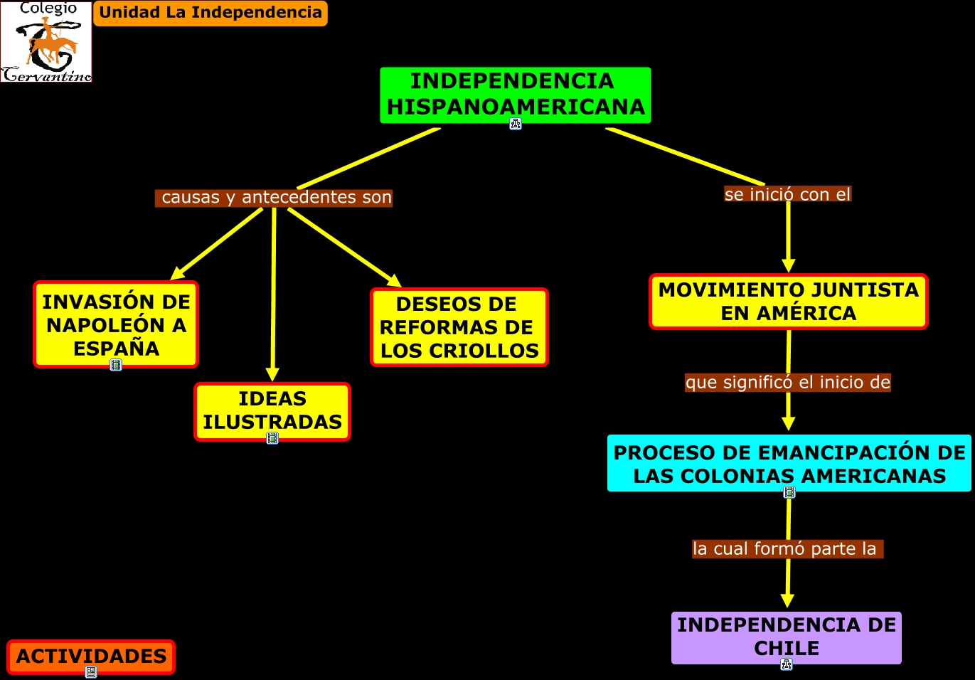 Este Cmap, tiene información relacionada con: Unidad 4 Independencia, INDEPENDENCIA HISPANOAMERICANA causas y antecedentes son INVASIÓN DE NAPOLEÓN A ESPAÑA, MOVIMIENTO JUNTISTA EN AMÉRICA que significó el inicio de PROCESO DE EMANCIPACIÓN DE LAS COLONIAS AMERICANAS, INDEPENDENCIA HISPANOAMERICANA se inició con el MOVIMIENTO JUNTISTA EN AMÉRICA, INDEPENDENCIA HISPANOAMERICANA causas y antecedentes son IDEAS ILUSTRADAS, PROCESO DE EMANCIPACIÓN DE LAS COLONIAS AMERICANAS la cual formó parte la INDEPENDENCIA DE CHILE, INDEPENDENCIA HISPANOAMERICANA causas y antecedentes son DESEOS DE REFORMAS DE LOS CRIOLLOS