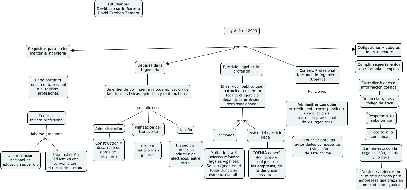 Este Cmap, tiene información relacionada con: Mapa conceptual Ley 842, Respetar a los subalternos ???? Ofrecerse a la comunidad, Se entiende por ingenieria toda aplicación de las ciencias fisicas, quimicas y matematicas se aplica en Diseño, Aviso del ejercicio ilegal ???? COPNIA deberá dar aviso a cualquier de las empresas, de la denuncia instaurada, Deberes de la Ingenieria ???? Se entiende por ingenieria toda aplicación de las ciencias fisicas, quimicas y matematicas, Consejo Profesional Nacional de Ingenieria (Copnia) contiene Ejercicio ilegal de la profesion, Ofrecerse a la comunidad ???? Ser honesto con la organización, cliente y colegas, Planeación del transporte ???? Terrestre, nautico y en general, Cumplir requerimientos que formula el copnia ???? Custodiar bienes o información cofiada, Ejercicio ilegal de la profesion ???? El servidor publico que patrocine, encubre o facilite el ejercicio ilegal de la profesion sera sancionado, El servidor publico que patrocine, encubre o facilite el ejercicio ilegal de la profesion sera sancionado tendra Aviso del ejercicio ilegal, Sanciones ???? Multa de 2 a 5 salarios mínimos legales vigentes. Se consignan en el lugar donde se evidencia la falta, Adminsitrar cualquier procedimiento correspondiente a inscripción a matricula profesional de los ingenieros ???? Denunciar ante las autoridades competentes la violación de esta norma, El servidor publico que patrocine, encubre o facilite el ejercicio ilegal de la profesion sera sancionado tendra Sanciones, Ley 842 de 2003 contiene Obligaciones y deberes de un ingeniero, Custodiar bienes o información cofiada ???? Denunciar faltas al codigo de ética, Tener la tarjeta profesional Haberse graduado de: Una insitución educativa con convenio con el territorio nacional, Consejo Profesional Nacional de Ingenieria (Copnia) contiene Requisitos para poder ejercer la ingenieria, Administración ???? Construcción y desarrollo de obras de ingenieria, Ser honesto con la organización, cliente y colegas ???? No debera ejercer en el mismo periodo para empreseas que trabajen en contextos iguales, Denunciar faltas al codigo de ética ???? Respetar a los subalternos