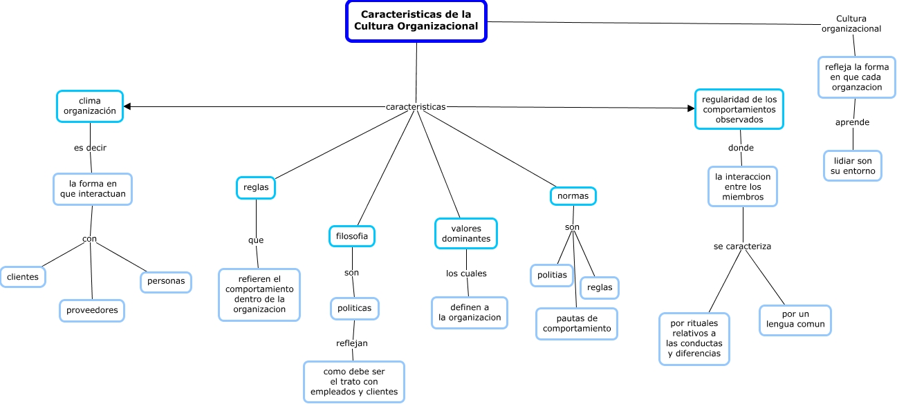 Este Cmap, tiene información relacionada con: Caracteristicas de la cultura organizacional, normas son politias, politicas reflejan como debe ser el trato con empleados y clientes, Caracteristicas de la Cultura Organizacional Cultura organizacional refleja la forma en que cada organzacion, valores dominantes los cuales definen a la organizacion, filosofia son politicas, Caracteristicas de la Cultura Organizacional caracteristicas valores dominantes, la interaccion entre los miembros se caracteriza por un lengua comun, reglas que refieren el comportamiento dentro de la organizacion, regularidad de los comportamientos observados donde la interaccion entre los miembros, la interaccion entre los miembros se caracteriza por rituales relativos a las conductas y diferencias, normas son reglas, Caracteristicas de la Cultura Organizacional caracteristicas filosofia, Caracteristicas de la Cultura Organizacional caracteristicas reglas, Caracteristicas de la Cultura Organizacional caracteristicas normas, clima organización es decir la forma en que interactuan, refleja la forma en que cada organzacion aprende lidiar son su entorno, la forma en que interactuan con proveedores, Caracteristicas de la Cultura Organizacional caracteristicas clima organización, normas son pautas de comportamiento, la forma en que interactuan con clientes